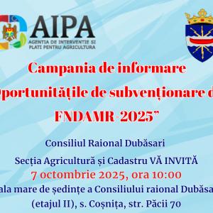 Campania de informare AIPA „Oportunitățile de subvenționare din FNDAMR-2025” ajunge în raionul Dubăsari ![]() Agenția de Intervenție și Plăți în Agricultură (AIPA), în conformitate cu misiunea sa de a susține financiar producătorii agricoli și comunitățile locale pentru dezvoltarea sectorului agroindustrial și a mediului rural, reflectată în Hotărârea Guvernului nr. 20/2019, lansează Campania de informare „Oportunitățile de subvenționare din FNDAMR-2025”. Această inițiativă are loc în contextul lansării de către Ministerul Agriculturii și Mediului Rural a trei apeluri de depunere a cererilor de subvenționare și are drept scop facilitarea accesului producătorilor agricoli la mecanismele de sprijin financiar disponibile. În acest sens, Consiliul raional Dubăsari, prin Secția Agricultură și Cadastru, invită toți doritorii să participe la sesiunea de informare care va avea loc pe data de 7 octombrie 2025, ora 10:00, în sala mare de ședințe a Consiliului raional Dubăsari (etajul II), s. Coșnița, str. Păcii 70. În cadrul evenimentului, echipa AIPA va prezenta informații utile privind: