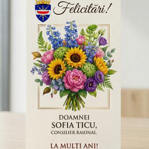 La mulți ani, Doamna Consilier Sofia Ticu! ![]() Consiliul Raional Dubăsari adresează cele mai sincere felicitări Doamnei Sofia Ticu, Consilier raional, cu prilejul aniversării zilei de naștere. Apreciem în mod deosebit implicarea activă în procesul decizional, profesionalismul și spiritul civic de care dați dovadă în activitatea desfășurată în cadrul Consiliului Raional. Vă dorim multă sănătate, putere de muncă și realizări frumoase în continuare, în interesul și beneficiul cetățenilor raionului Dubăsari. Fie ca toate proiectele inițiate să se bucure de succes, iar satisfacțiile să fie pe măsura eforturilor depuse. La mulți ani! Cu respect, Președintele raionului, Sergiu GRIGORIEV |