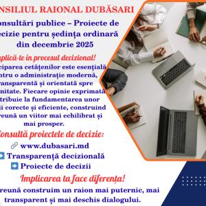 Transparență și dialog – împreună construim viitorul raionului Dubăsari ![]() Participarea cetățenilor în procesul decizional reprezintă fundamentul unei administrații locale transparente și eficiente. Implicarea activă a comunității contribuie la adoptarea unor decizii mai bine fundamentate, reflectând nevoile reale ale oamenilor. Fiecare opinie contează, iar vocea cetățenilor devine o forță care susține dezvoltarea durabilă a raionului și consolidarea unui climat de încredere între administrație și societate. Prin implicare, fiecare locuitor își aduce aportul la construirea unui viitor mai sigur, mai echitabil și mai prosper pentru întreaga comunitate. Consiliul raional Dubăsari aduce la cunoștința publicului inițierea consultărilor publice asupra proiectelor de decizie ce urmează a fi examinate în ședința ordinară a Consiliului raional din luna decembrie 2025. Acțiunea are loc în conformitate cu prevederile Legii nr. 234/2008 privind transparența în procesul decizional. Cetățenii, reprezentanții societății civile și toate părțile interesate sunt invitați să transmită propuneri, opinii și recomandări privind proiectele de decizie aflate în consultare. Observațiile pot fi expediate la adresele electronice ale raportorilor, autorilor de proiecte sau la adresa oficială a Consiliului raional Dubăsari: consiliudubasari@gmail.com sau consiliul.raional-dubasari@apl.gov.md Proiectele de decizie pot fi accesate pe site-ul oficial al Consiliului raional Dubăsari: www.dubasari.md, în Secțiunea „Transparență decizională”, rubrica „Proiecte de decizii”. Consiliul raional Dubăsari încurajează participarea tuturor cetățenilor la procesul decizional local. |
