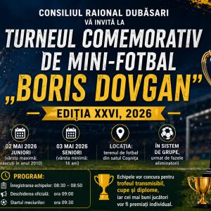 Turneul comemorativ la mini-fotbal „Boris Dovgani”, ediția a XXVI-a ![]() Consiliul Raional Dubăsari are plăcerea de a anunța organizarea ediției din acest an a Turneului Comemorativ de Mini-Fotbal, în memoria eroului Boris Dovgani, o figură emblematică a comunității noastre dubăsărene și un simbol al curajului și al integrității, decedat în 1992. Turneul dat este organizat anul de către dl Vladimir DIORDIȚA. Unitate, Tradiție și Progres – Prin Sport!” Această competiție tradițională, desfășurată anual pe terenul sportiv din satul Coșnița, nu este doar un eveniment sportiv, ci o manifestare a unității noastre, a respectului pentru istorie și a dorinței de a construi un viitor mai sănătos și mai puternic prin tineret și sport. Programul competiției: Turneul se va desfășura pe terenul de fotbal din s. Coșnița, după următorul program: 02 mai 2026: Competiții între echipele de juniori (vârsta maximă, anul nașterii 2010); 03 mai 2026: Competiții între echipele de seniori (vârsta minimă 16 ani). Agenda zilnică: 08:30 – 08:50: Înregistrarea echipelor; 09:00: Deschiderea oficială a evenimentului; 09:30: Startul jocurilor. Condiții de participare: Echipele vor fi formate din maximum 12 jucători, care trebuie să fie originari/băștinași din localitatea reprezentată sau angajați ai instituției respective. Pe teren vor activa 6 jucători (inclusiv portarul), cu un număr nelimitat de înlocuiri. De ce să participi sau să fii spectator? Sport de Calitate: Vizionează meciuri spectaculoase între cele mai bune echipe de juniori și seniori. Spirit de Echipă: Susține-ți echipa preferată într-o atmosferă vibrantă, plină de fair-play și pasiune pentru fotbal. Onoare și Amintire: Fii parte dintr-un eveniment care onorează memoria unui adevărat patriot, Boris Dovgani, și promovează valorile pe care le-a reprezentat. Comunitate: Întâlnește-te cu prieteni, vecini și autorități locale pentru a celebra spiritul comunitar prin sport. Cupa transmisibilă își așteaptă noii campioni! Cine va pleca acasă cu marele trofeu și cu titlul de campion al raionului Dubăsari? Te așteptăm cu drag să vii, să susții, să joci și să fii parte din istoria sportivă a raionului nostru! |